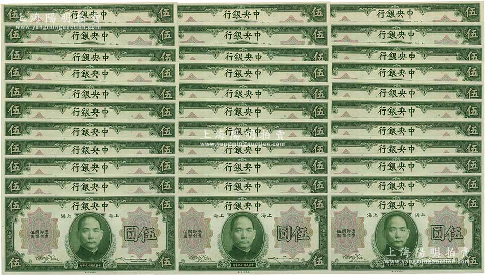 民国十九年(1930年)中央银行伍圆共33枚断续连号,上海地名,单面号,李骏耀·田亦民绿签名;海外回流,全新绝品
