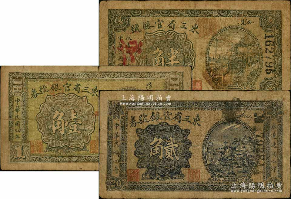 民国四年(1915年)东三省官银号半角、壹角、贰角共3枚不同,原票七成新