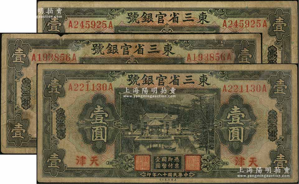民国十八年(1929年)东三省官银号壹圆共3枚,均为东三省改天津地名,源于前辈名家之遗存,自然七成新