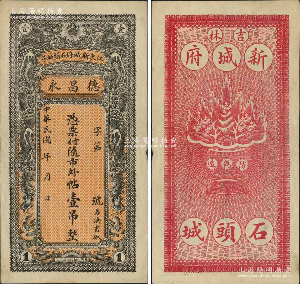 民国年(江东新城府石头城子)德昌永·凭票付随市外帖壹吊,吉林新城府(至1914年改名扶餘县)钱庄钞票,上印双龙戏珠图,背印聚宝盆;少见,八五成新
