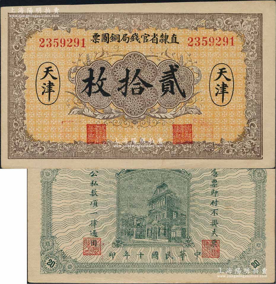 民国十年(1921年)直隶省官钱局铜圆票贰拾枚,天津地名,背印“辰”字;源于森本勇先生之旧藏,少见,九八成新