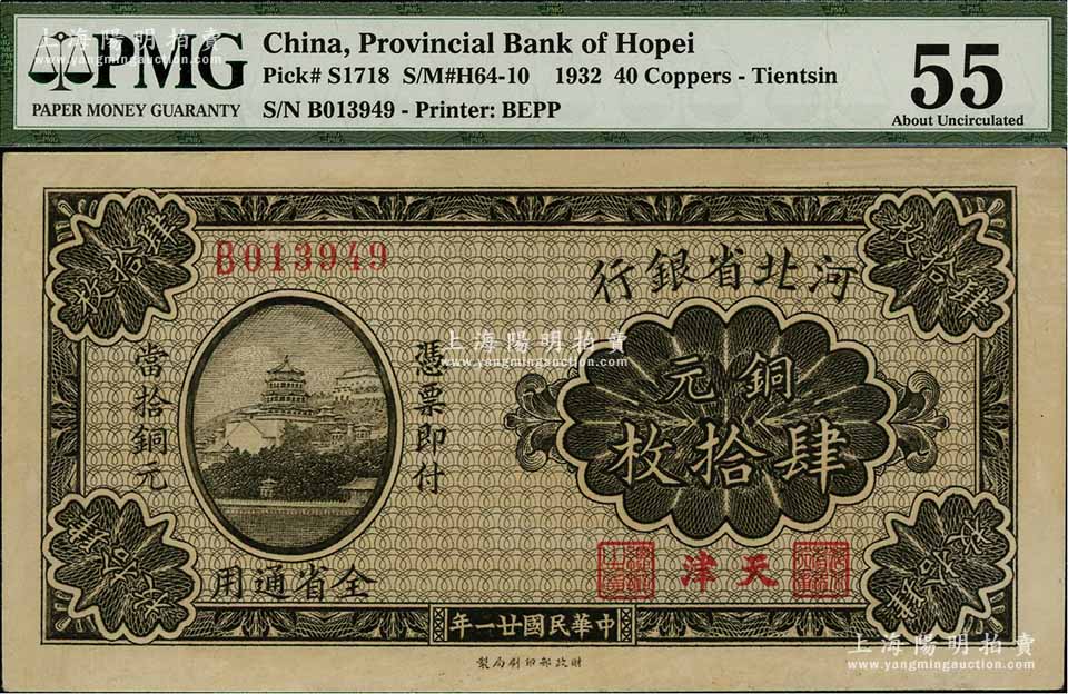 民国廿一年(1932年)河北省银行铜元肆拾枚,天津地名,少见,未折九五成新