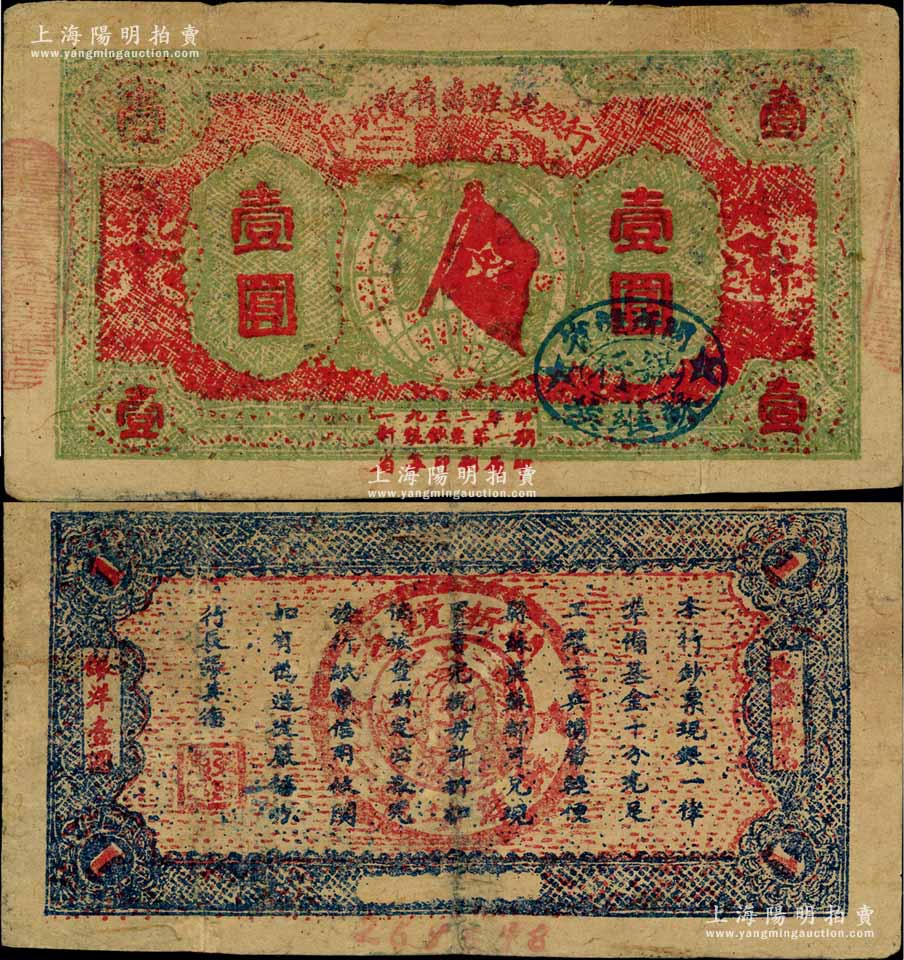 1933年闽浙赣省苏维埃银行壹圆,红底草绿色印刷,正面椭圆形印章为蓝色版(另有所见印章为黑色版),背面为蓝色印刷(另有黑色印刷者),七五成新