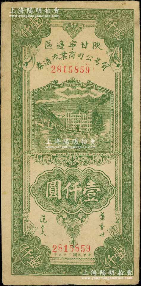 民国三十五年(1946年)陕甘宁边区贸易公司商业流通券绿色工厂大厦图壹仟圆,八成新