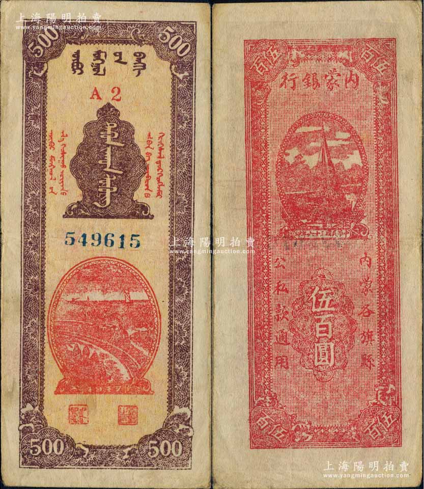 民国三十六年(1947年)内蒙银行伍百圆,A2冠字版,背面洋红色印刷,诚属中国革命根据地纸币之珍罕品,八成新