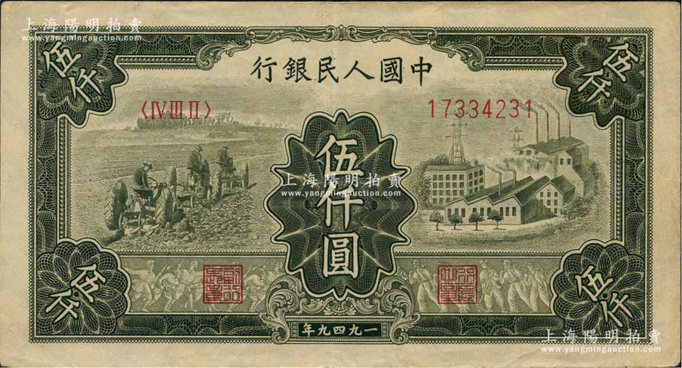 第一版人民币“三拖与工厂”伍仟圆,近九成新