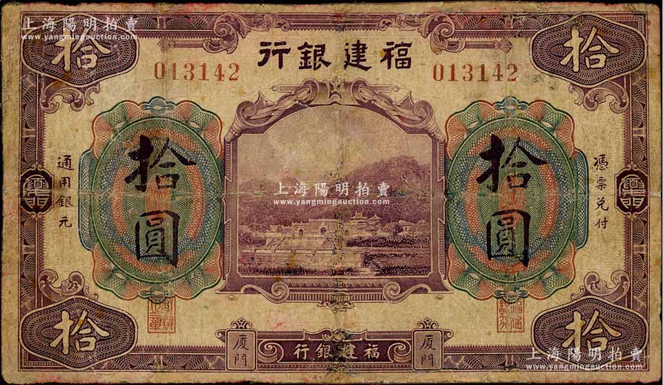 福建银行美钞版紫色拾圆,厦门地名,有修补,近七成新