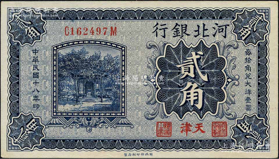 民国十八年(1929年)河北银行贰角,天津地名,前后字轨小号码券,背印总办鲁穆庭英文签名;森本勇先生藏品,九八成新