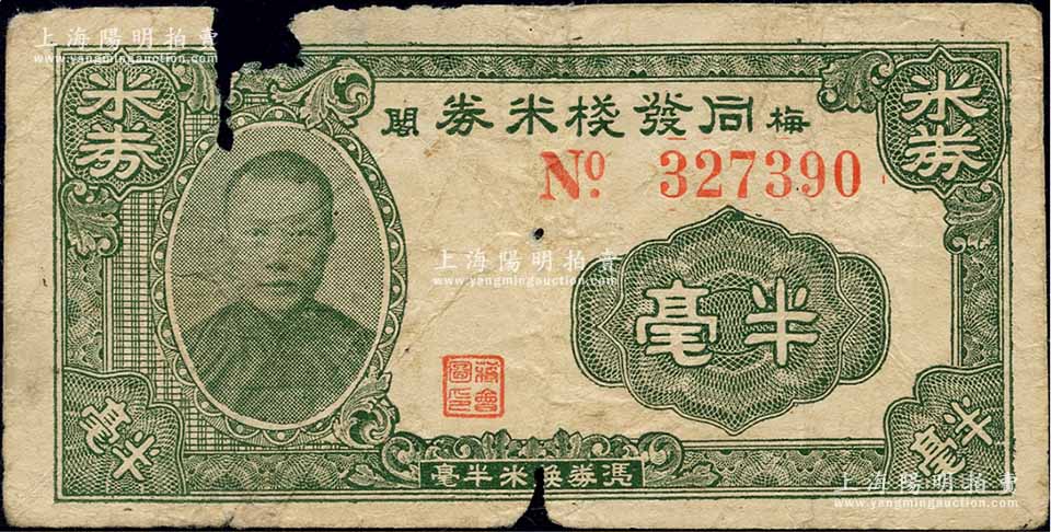民国三拾年(1941年)同发栈米券半毫,“梅阁”地名,乃属广东新会县民间钞票,上印人像图;森本勇先生藏品,少见,有缺损,近六成新