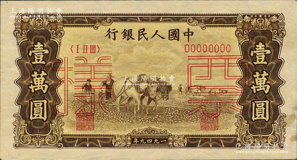 第一版人民币“双马耕地图”壹万圆票样,正背共2枚,森本勇先生藏品,九至九五成新