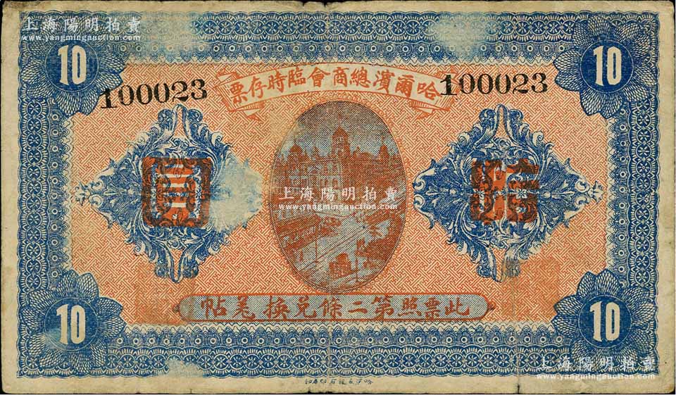 民国八年(1919年)哈尔滨总商会临时存票拾圆,以沙俄羌帖为货币单位,七五成新