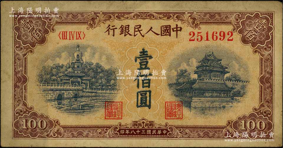 第一版人民币“黄北海桥”壹佰圆,八成新