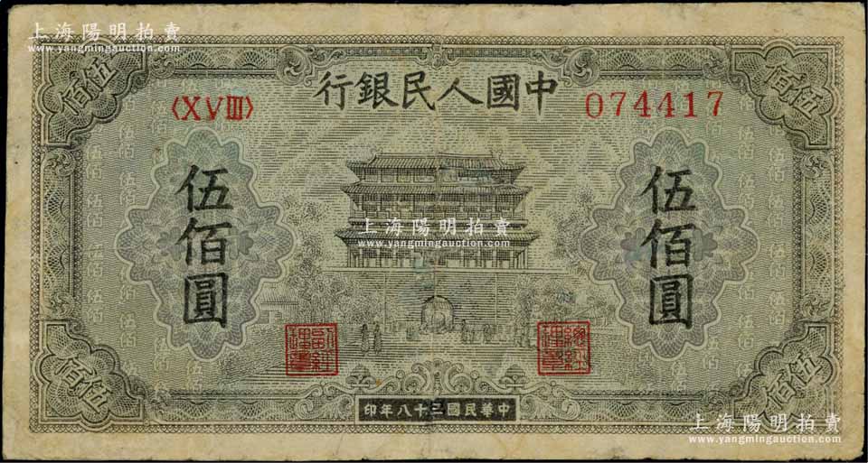第一版人民币“正阳门”伍佰圆,有修补,七成新