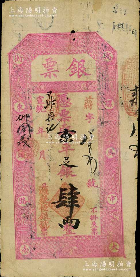 宣统年(北京·寓骡马市大街东头路南)源聚恒银号“银票”京平足银肆两,有背书十余处,可证其辗转流通于京师;江南藏家出品,原票七五成新