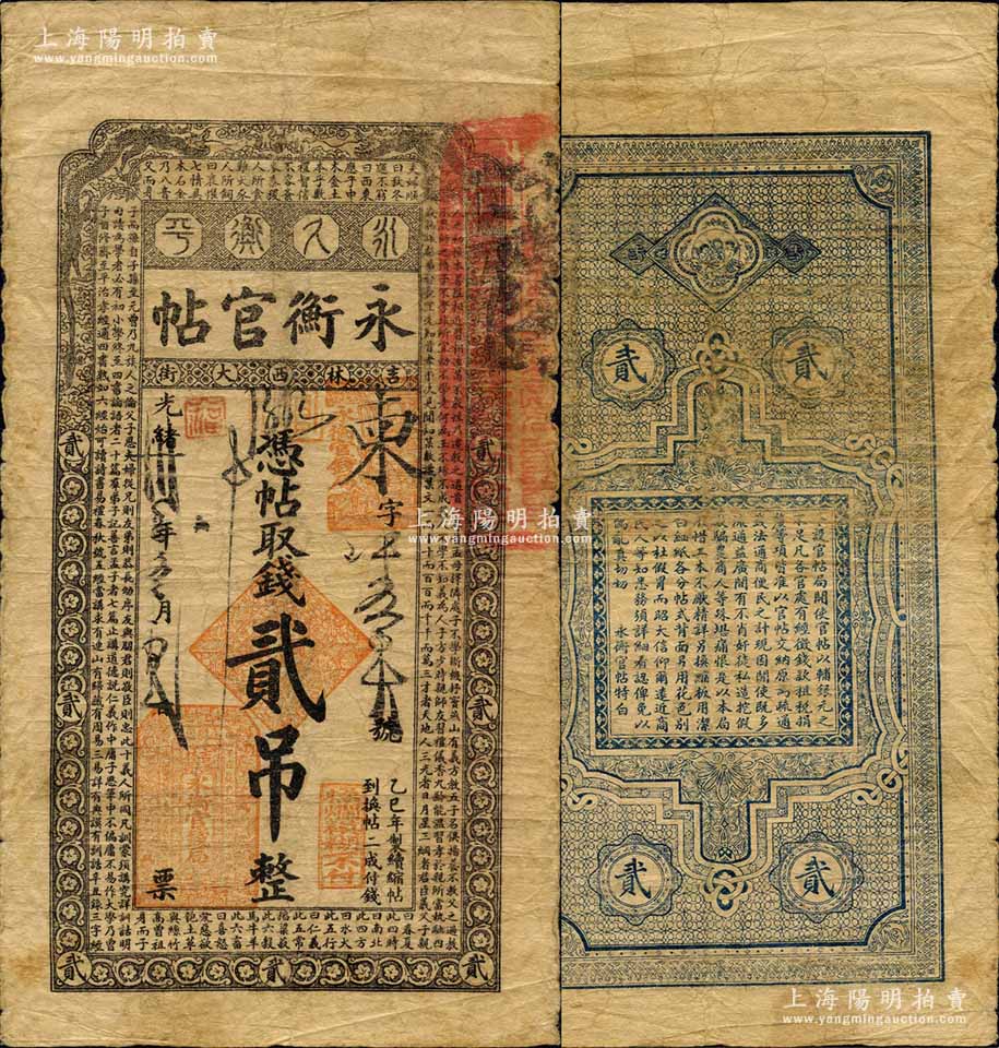 光绪卅一年(1905年)吉林永衡官帖贰吊,乙巳版,上印双龙戏珠图和《三字经》;日本回流品,少见且品相自然,七五成新
