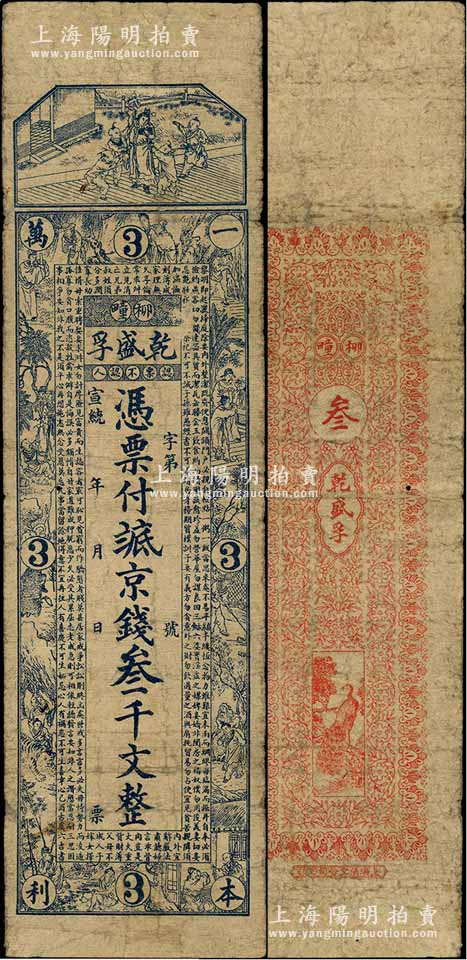宣统年(1909-11年)乾盛孚京钱叁千文,山东昌邑县柳疃钱庄钞票,上海藻文公司石印,上印二十四孝图及《治家格言》古文,少见,七成新