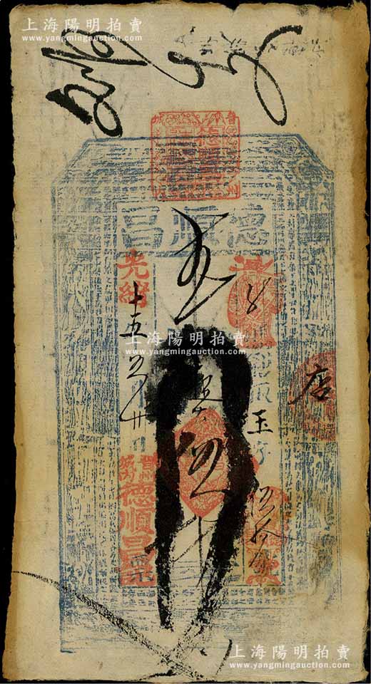 光绪十五年(1889年)德顺昌·九扣大钱伍千文,直隶晋州钱庄钞票,上印八仙图及古文,少见,七五成新