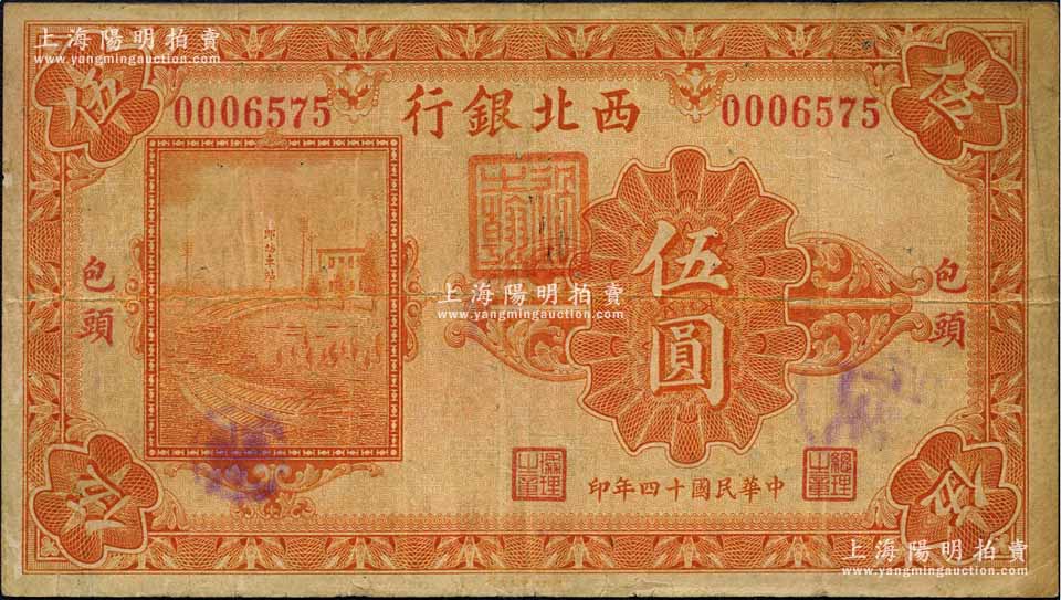 民国十四年(1925年)西北银行单色版伍圆,包头地名,原票七五成新