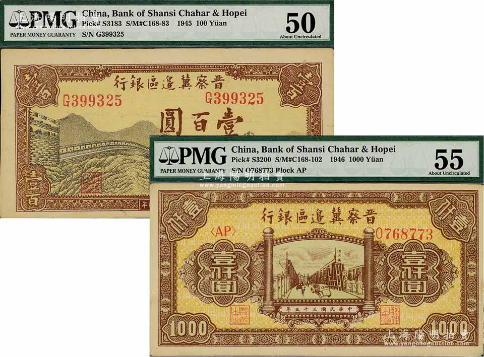 晋察冀边区银行1945年长城图壹百圆、1946年清河桥壹仟圆共2枚不同,九五至九八成新