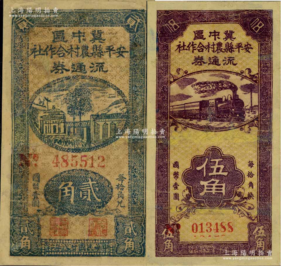 民国廿八年(1939年)冀中区安平县农村合作社流通券贰角、伍角共2枚不同,有修补,六至七成新