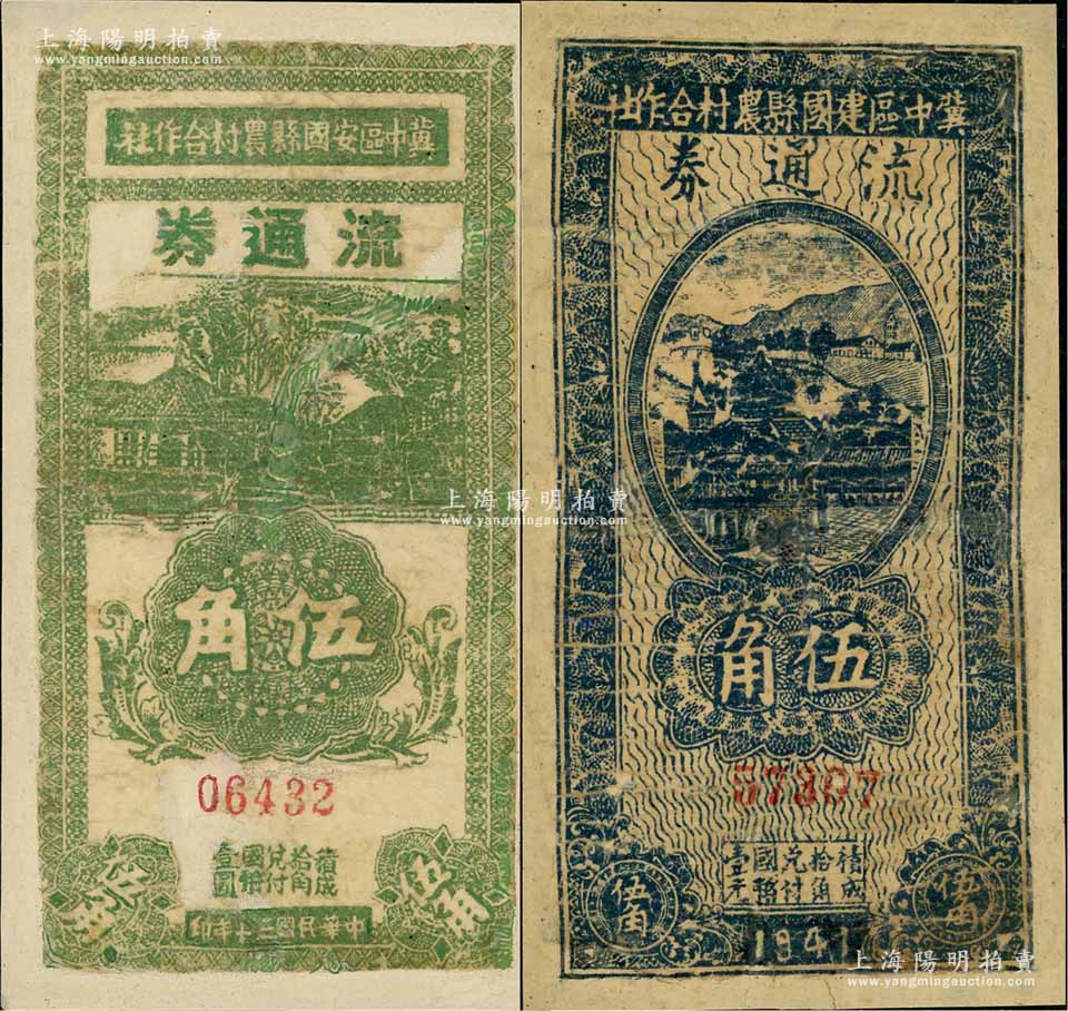民国三十年(1941年)冀中区安国县农村合作社流通券伍角、冀中区建国县农村合作社流通券伍角共2枚不同,有修补,六成新