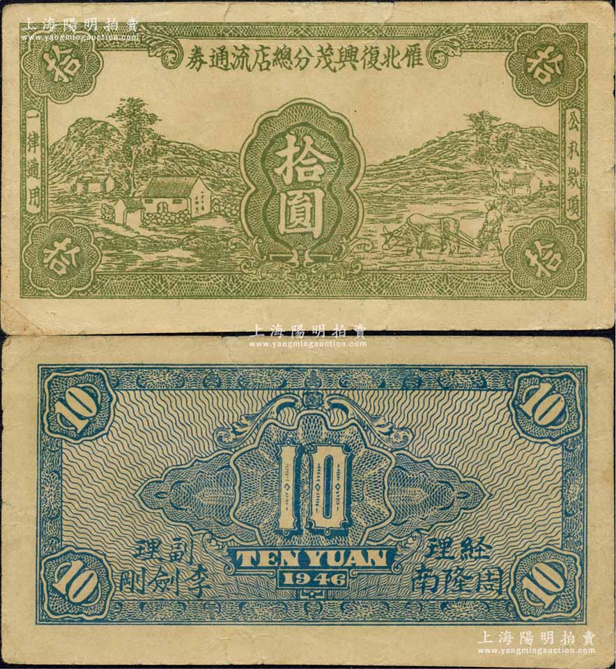1946年雁北复兴茂分总店流通券拾圆,乃属晋察冀革命根据地纸币,流通于山西雁门关东北部;前辈藏家出品,少见,近八成新(注:此券在阳明2016年春季《玉胜金石》专场Lot 786曾拍卖有1枚,其成交价高达21850元。)
