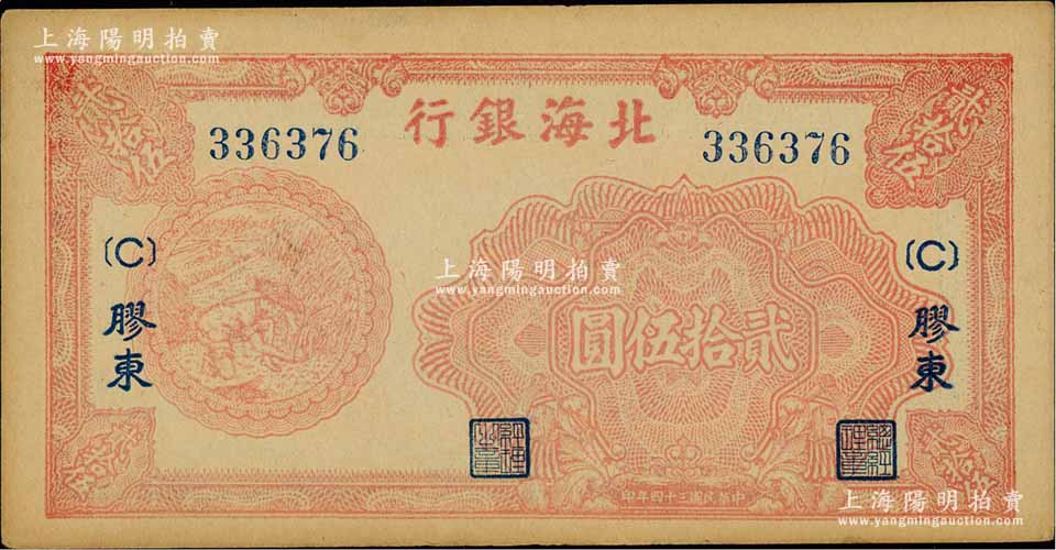 民国三十四年(1945年)北海银行桔红色割麦图贰拾伍圆,胶东地名,未折九至九五成新
