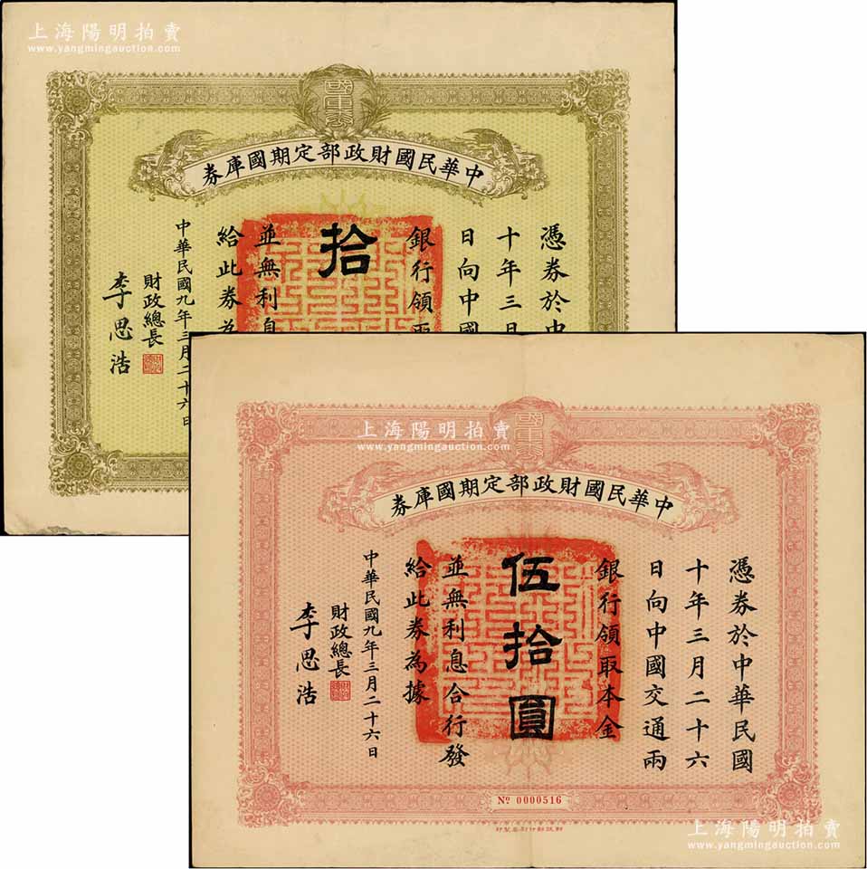 民国九年3月26日(1920年)中华民国财政部定期国库券拾圆、伍拾圆共2枚不同,由财政总长李思浩(浙江慈溪人)签名;柏文先生藏品,八成新
