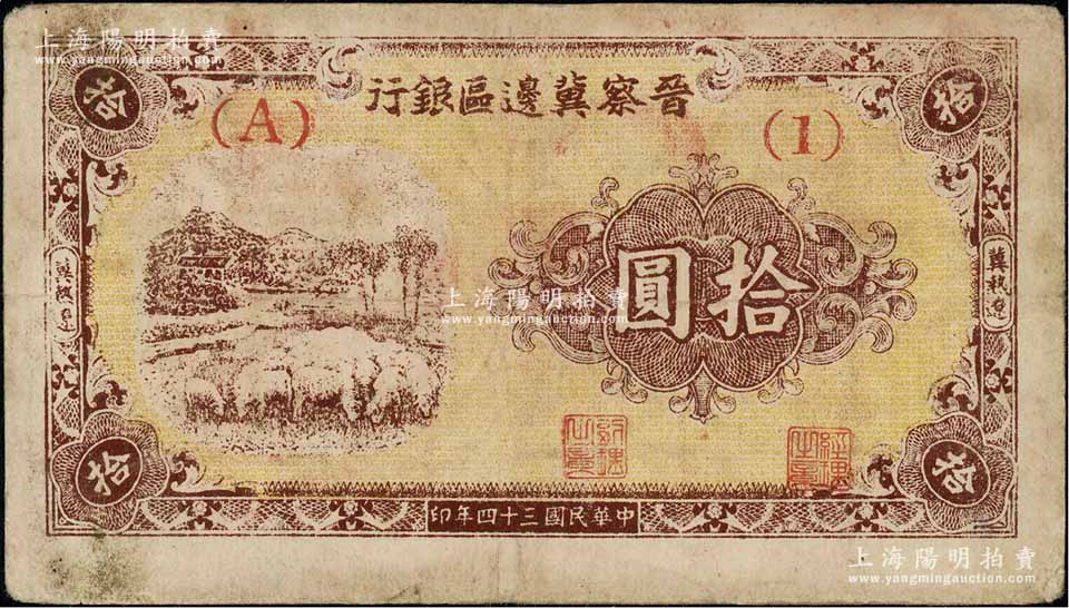 民国三十四年(1945年)晋察冀边区银行绵羊图拾圆,冀热辽地名,短号(A)1券;源于藏家出品,少见,近八成新