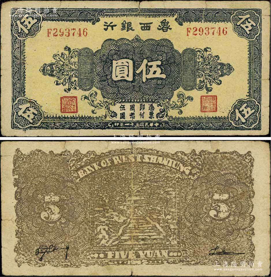 民国三十一年(1942年)鲁西银行伍圆,F字轨,背为褐色印刷,原票七成新