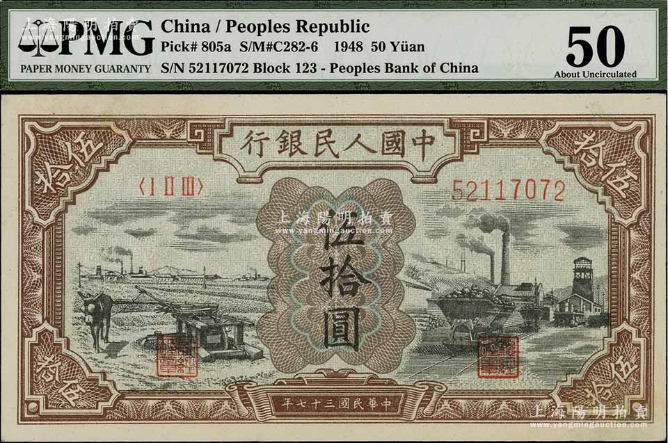 第一版人民币“驴子与矿车图”伍拾圆,PMG 50 AU,敬请预览
