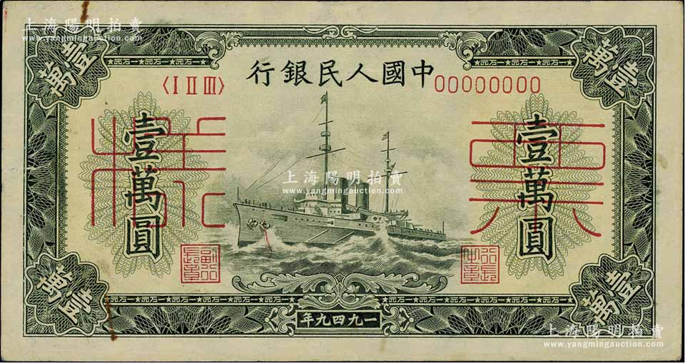 第一版人民币“军舰图”壹万圆票样,正背面合印,八五成新