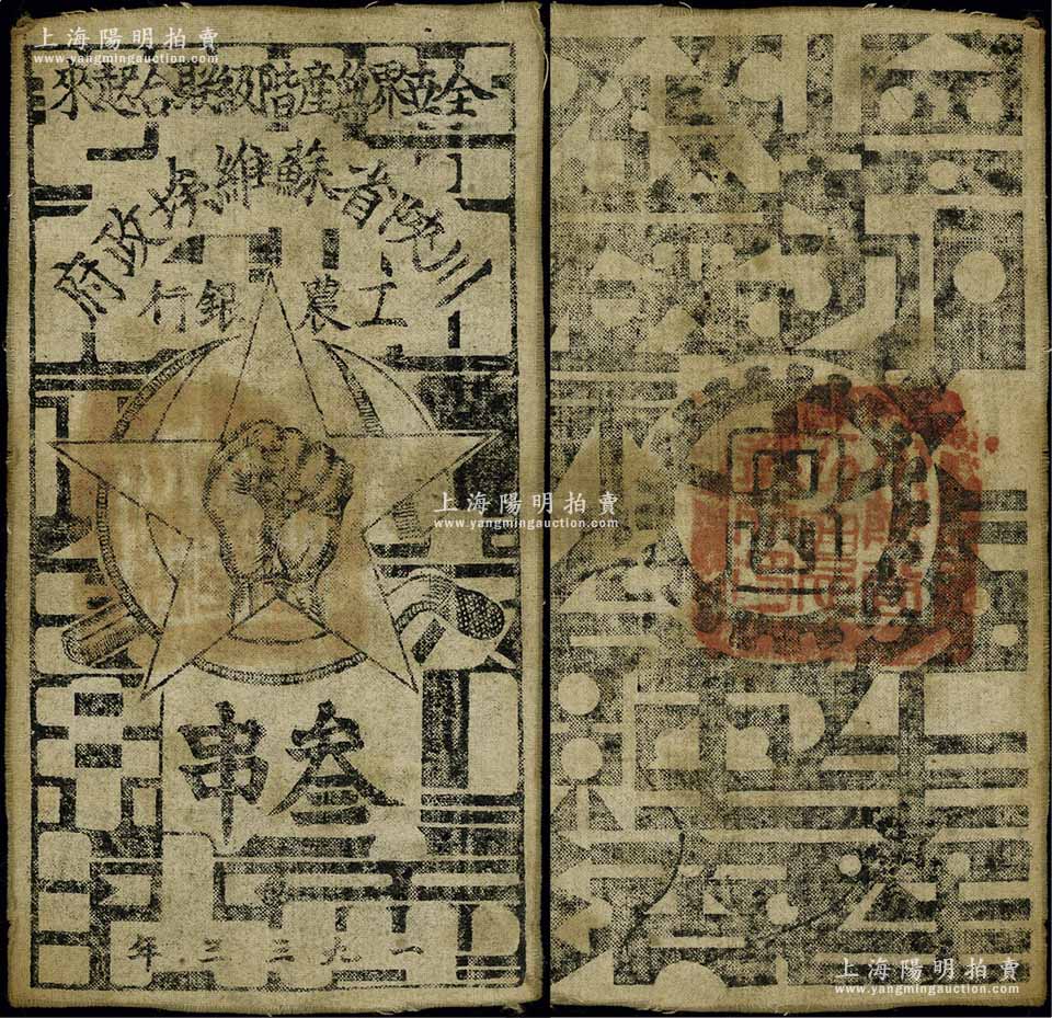 1933年川陕省苏维埃政府工农银行叁串布币,白细布印刷,正面无椭圆形印章版;江南宁泰堂藏品,源于著名集钞家吴筹中先生之旧藏,八成新
