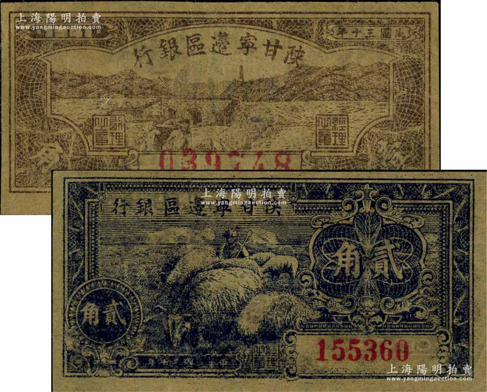 民国三十年(1941年)陕甘宁边区银行壹角、贰角共2枚不同,江南宁泰堂藏品,九至九五成新