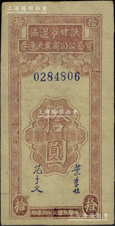 民国三十四年(1945年)陕甘宁边区贸易公司商业流通券拾圆,江南宁泰堂藏品,八五成新