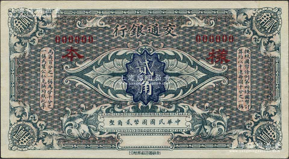 交通银行(1914年)国币贰角样本券,江南藏家出品,九八成新