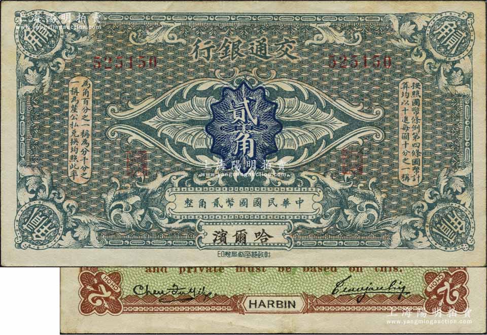 交通银行(1914年)国币贰角,哈尔滨地名,无字轨,曹汝霖·陈福颐签名;江南藏家出品,八五成新(驻:此券之左边签名共分陈福颐和谢霖2种不同,值得钞友区分!)