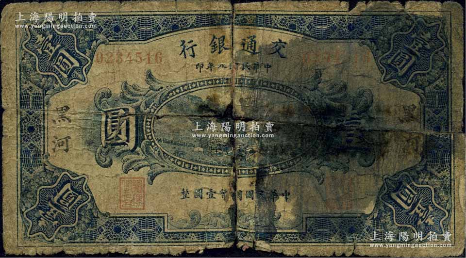 民国八年(1919年)交通银行壹圆,黑河地名,曹汝霖·谢霖签名,此种地名券存世罕见;江南藏家出品,破损品,背有贴补,敬请预览