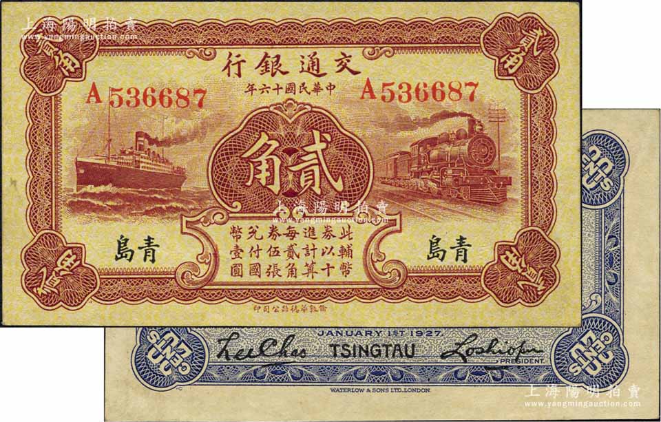 民国十六年(1927年)交通银行棕红色贰角,青岛地名,单字轨,背印卢学溥·李锺楚签名;江南藏家出品,九八成新