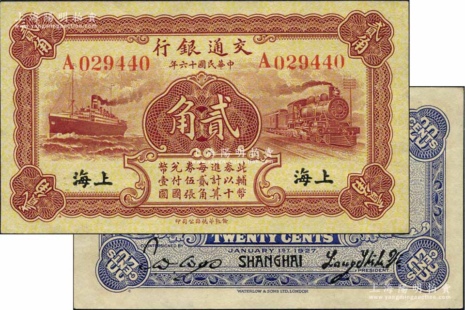 民国十六年(1927年)交通银行棕红色贰角,单字轨,上海地名为黑色印刷,背印梁士诒·胡孟嘉签名;江南藏家出品,九八成新