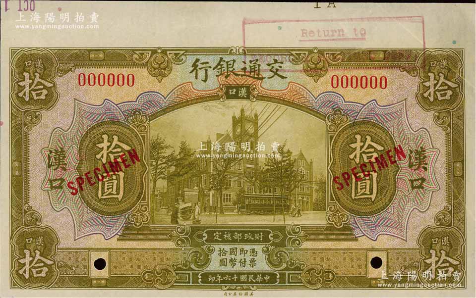 民国十六年(1927年)交通银行黄绿色拾圆样本券,汉口地名,江南藏家出品,九成新