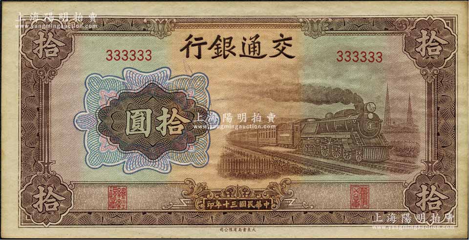 民国三十年(1941年)交通银行大东版拾圆,为333333之趣味号码券,颇为难得;江南藏家出品,原票未折九五成新