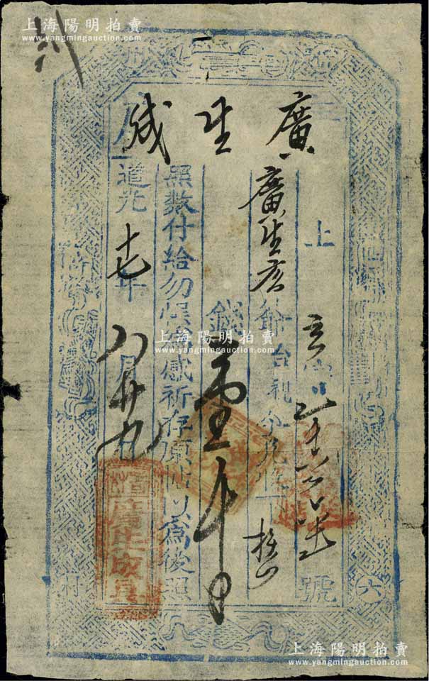 道光十七年(1837年)广生成壹千文,山西忻州钱庄钞票,上印暗八仙纹饰;美国奚峥云先生藏品,少见,近八成新