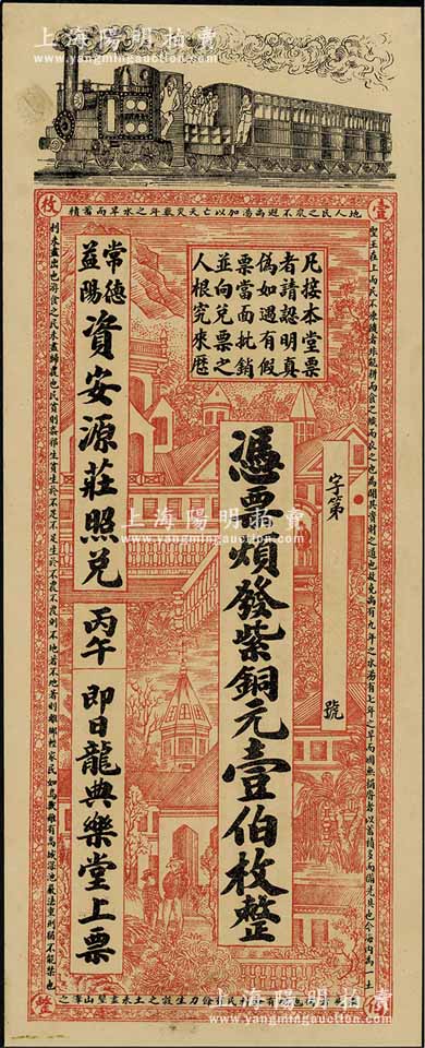 清代丙午年(1906年)龙典乐堂·紫铜元壹伯枚,湖南安化县钱庄钞票,可在常德、益阳资安源庄照兑,上印火车、洋房图,背印双狮、花卉及告白文字,票幅宏大,图案美观,九至九五成新