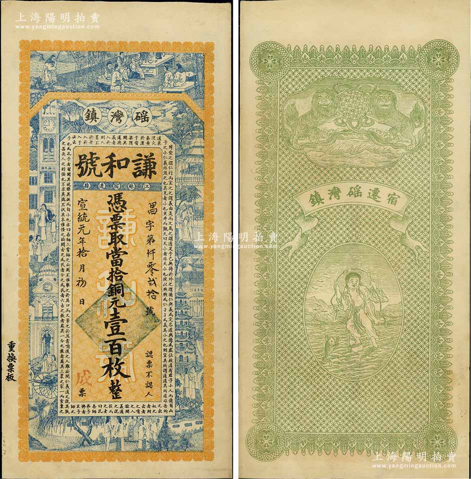 宣统元年(1909年)谦和号·当拾铜元壹百枚,江苏宿迁磘湾镇钱庄钞票,上印竹林七贤、上海景观及唐代韩愈《原道》,背印双狮及刘海戏金蟾图,印刷美观;美国奚峥云先生藏品,源于日本名家森本勇先生之旧藏,罕见,九五成新