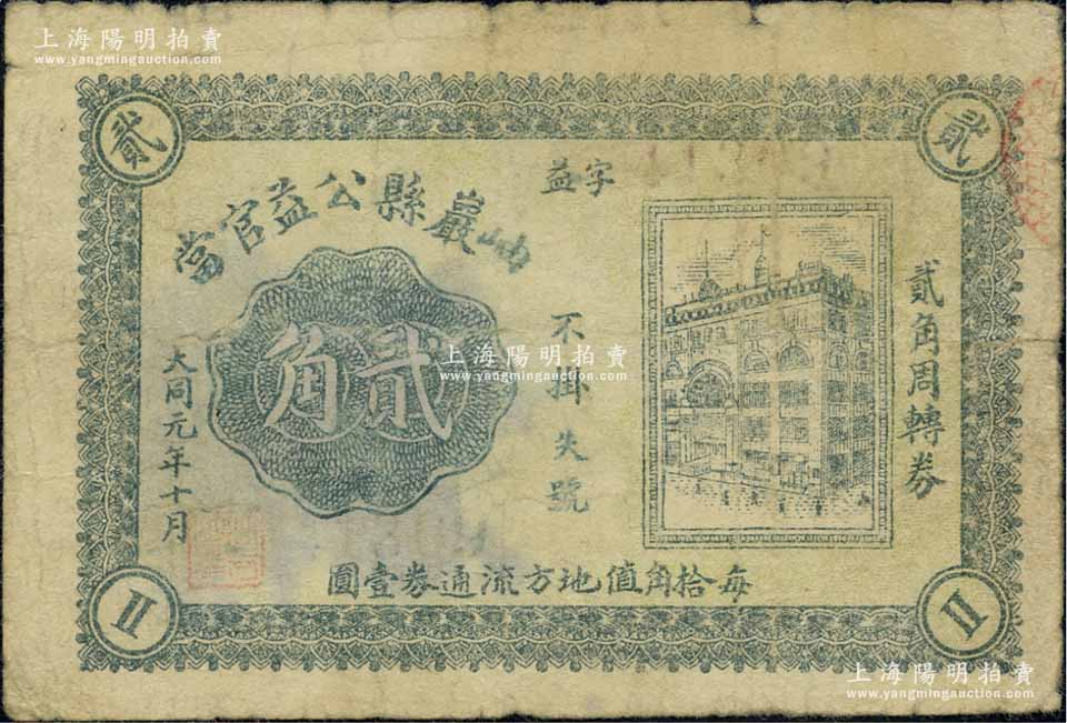 大同元年(1932年)岫岩县公益官当贰角,属伪满洲国大同年号之典当业私帖;北方名家藏品,且为2013年天津宝坻《中国第二届历代纸币展图集》第272页之图片原物,珍罕,七成新