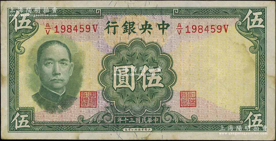 民国三十年(1941年)中央银行华德路版伍圆,少见品种,八五成新