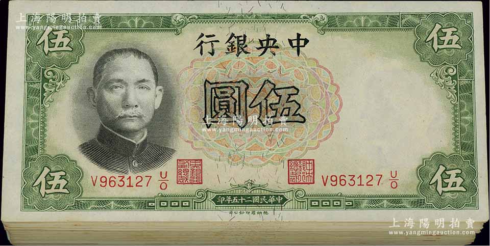 民国二十五年(1936年)中央银行德纳罗版伍圆共100枚,部分连号;江南雁门堂藏品,除个别有瑕疵外,整体约未折九五成新,敬请预览