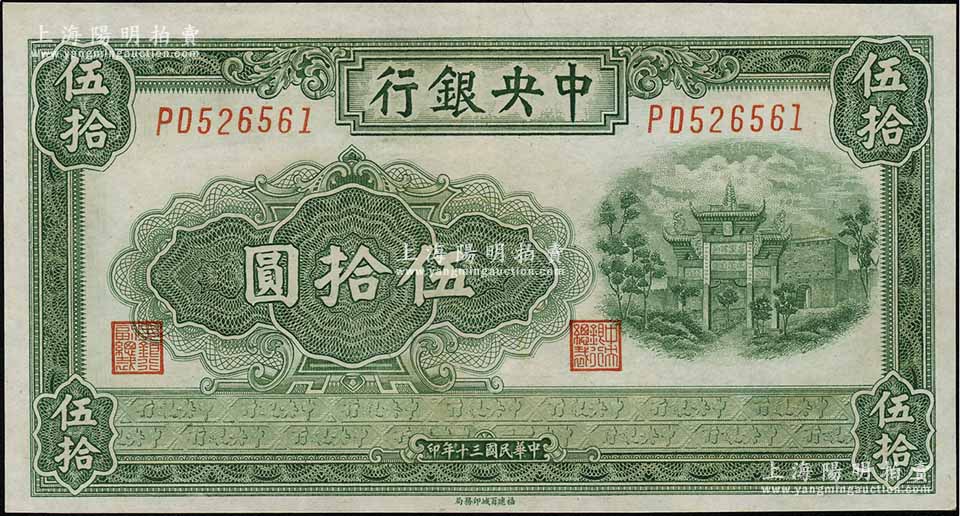 民国三十年(1941年)中央银行福建百城版伍拾圆,九成新