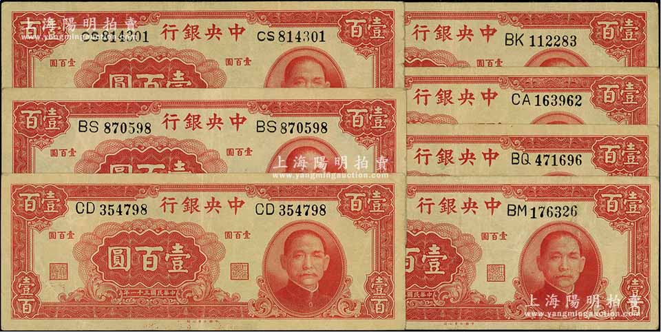 民国三十一年(1942年)中央银行大业版壹百圆共7枚,双字轨,均不同冠字,七五至八成新